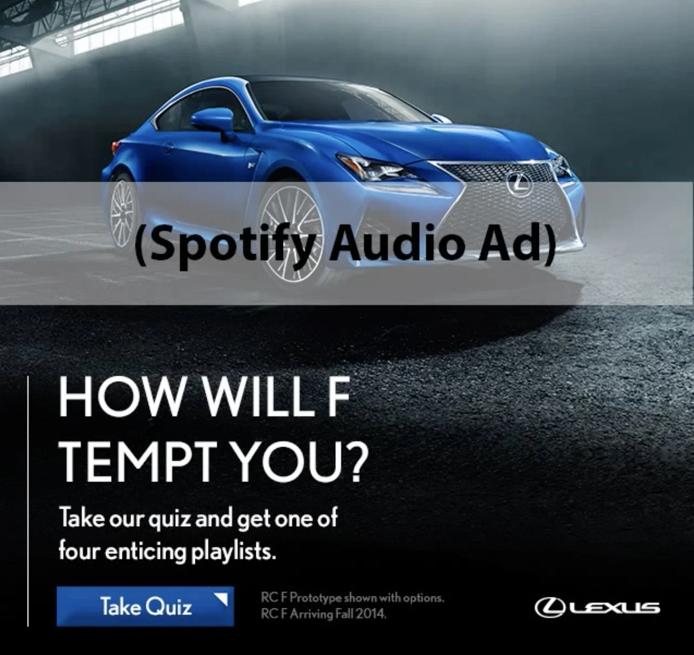 Spotify is proactive, proposing complete, buildable UX concepts to advertisers. Before presentation each potential project must be concepted, designed, and deemed possible either within the Spotify platform or on a microsite. Working with Pomegranate, Spotify has sold many unique and successful advertising experiences such as for the Lexus F line ("How Will F Tempt You?") which included ad units with audio prompts that encouraged users to take a brief personality quiz to receive a free playlist based on one of four temptations. Spotify also creates opportunities for entertainment clients and film titles, and joined with Blue Moon Brewing Co. to sponsor a summer long series of intimate music events across the country, the Follow The Moon Tour.